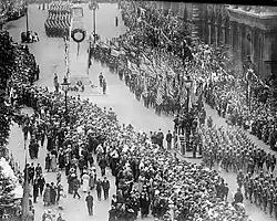Lutyens submitted his final design to the Office of Works in early July, and on 7 July received confirmation that the design had been approved by the foreign secretary, Lord Curzon, who was organising the parade.[21] The unveiling of the monument, built in wood and plaster by the Office of Works, was described in The Times as a quiet and unofficial ceremony. It took place on 18 July 1919, the day before the Victory Parade. Lutyens was not invited. During the parade, 15,000 soldiers and 1,500 officers marched past and saluted the Cenotaph—among them were American General John J. Pershing and French Marshal Ferdinand Foch, as well as the British commanders Field Marshal Sir Douglas Haig and Admiral of the Fleet Sir David Beatty. The Cenotaph quickly captured the public imagination. Repatriation of the dead had been forbidden since the early days of the war, so the Cenotaph came to represent the absent dead and serve as a substitute for a tomb. Beginning almost immediately after the Victory Parade and continuing for days afterwards, members of the public began laying flowers and wreaths around the memorial. Within a week, an estimated 1.2 million people came to the Cenotaph to pay their respects to the dead, and the base was covered in flowers and other tributes.[1][22][23] According to The Times, "no feature of the victory march in London made a deeper impression than the Cenotaph."[16][24][25]