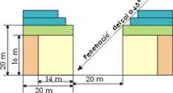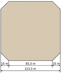 The dimensions of the blocks are given by the aforementioned distances between the longitudinal axes of the streets and the same width of these roads, so that by establishing a standard width of 20 meters, the blocks are formed by quadrilaterals of 113.3 meters, their vertices truncated in the form of a chamfer of 15 meters, which gives a block area of 1.24 hectares, contrary to popular belief that they have an exact area of 1 hectare. The figure of 113.3 meters has had various justifications. Manuel de Solà-Morales considers that the 5 blocks between the old bastion of Tallers (now Plaça Universitat) and that of Jonqueres (now Plaça Urquinaona) are the ones that mark the factor from which the rest is built.[27]