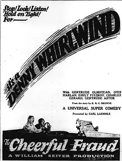 The Cheerful Fraud is a 1927 American silent comedy film directed by William A. Seiter and starring Reginald Denny, Gertrude Olmstead, and Otis Harlan. It was produced and distributed by Universal Pictures.[1][2] It is based on a 1925 novel of the same title by British writer Kenneth Robert Gordon Browne.[3]
