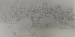 Favén picked up this work out of fascination for the chess scene in Café de la Régence, a meeting place of internationally renowned chess players. The reputation of Café de la Régence was such that no great chess master would visit Paris without going to the Café de la Régence.[1] Because of their status, they would play the main role in Faven's painting. The following characters can be determined with some certainty : Siegbert Tarrasch, standing in the background, left; Frank Marshall in the middle with cigar; David Janowsky with cigarette, on the right of Marshall; Amos Burn, sitting facing Marshall, with pipe; and Ossip Bernstein (facing Burn).[2] And "around the big stars, smaller yet bright planets revolved": among the regulars of the café were all the stars of the Parisian chess community, some of whom probably are in the painting but remain thus far unidentified.