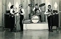 Rickrich immediately arranged a deal with Bismarck Records to record their first single, a version of the Drifters’ hit "Save the Last Dance for Me", backed by a female chorus.[1][2][3] On the flip side was an atmospheric instrumental ballad, "Dreams And Wishes" composed by guitarist Robert Patton.[1][2][3] Ron DiIulio left the Chessmen shortly thereafter, but remained at North Texas State, forming two short-lived bands, first the Rejects and then the New Sound in 1966.[1] He later joined Noel Odom & the Group and the Bad Habits from his hometown of Shreveport, Louisiana.[1] After keyboardist Ron DiIulio left the band in May 1965, the band auditioned several musicians to replace him, but on guitars, not keyboards during the intervening months between May and July.[1] At this time the group received several write-ups in the Denton Record-Chronicle that on listed three guitarists appearing with them on different occasions: Jimmy Herbert (mentioned as "Jimmy Kay"), Ricky Marshall, and Richard Dace.[1] Jim Herbert won the spot and joined the band as lead guitarist. Drummer Tom Carrigan met Jim Herbert while seeing him play various gigs around the NTSU campus, and invited Herbert to a band rehearsal at his mother's house, which was located just off the campus.[1] The group's new lineup consisted of Herbert on guitar, Patton on guitar and vocals, Carter on bass and vocals, and Carrigan on drums.[1][2]