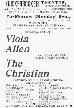 The Christian premiered at the Knickerbocker Theatre on October 10, 1898.[7] Viola Allen had top billing, with the author's name in much smaller letters, and unusually, all sixteen principals listed below the title.[21] The reviewer for The New York Times noted the theatre on opening night was crowded to the doors with no room for late-comers, which they attributed to Viola Allen rather than Hall Caine's talent as a dramatist.[7] They considered the play to be of doubtful artistic importance but thought it "not bad" as a popular "stage piece".[7]