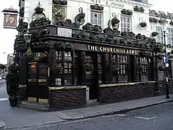 The pub is decorated with all types of things associated with Winston Churchill,[7] and falsely claims that Churchill made wartime broadcasts from the venue.[6] Churchill's grandparents, the 7th Duke of Marlborough and Lady Frances Anne Emily Vane, were patrons of the pub in the 19th century.[6]