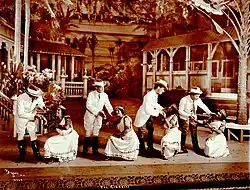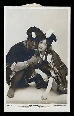 The piece opened at Daly's Theatre in London, managed by George Edwardes, on 5 March 1904 and ran until 11 March 1905 for a total of 365 performances.[1] The setting in an exotic Asian locale followed the precedent set by The Mikado that was continued in The Geisha, San Toy, The Nautch Girl, A Chinese Honeymoon and others. There is little in the music to give The Cingalee an Eastern flavour. However, Monckton's catchy sextet, "The Island of Gay Ceylon", his "Pearl of Sweet Ceylon" and Ruben's "White and Brown Girl", "Sloe Eyes", "Monkeys" and "You and I" are highlights of the musical score. The London cast included Hayden Coffin, Rutland Barrington, Huntley Wright and Isabel Jay. A young Lily Elsie also appeared in the show, as did Topsy Sinden.[2]