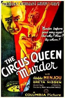 The Circus Queen Murder is a 1933 American pre-Code mystery film directed by Roy William Neill and starring Adolphe Menjou, Donald Cook and Greta Nissen. It is the sequel to the 1932 film The Night Club Lady in which Menjou had also starred as Thatcher Colt.[1] The film is based on a story by "Anthony Abbott", a pseudonym used by Fulton Oursler.