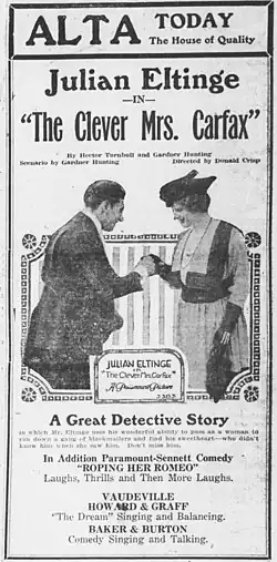 The Clever Mrs. Carfax is a 1917 American comedy silent film directed by Donald Crisp and written by Gardner Hunting and Hector Turnbull. The film features female impersonator Julian Eltinge and stars Daisy Jefferson, Noah Beery, Sr., Rosita Marstini, Jennie Lee, and Fred Church. The film was released on November 5, 1917, by Paramount Pictures.[1][2]