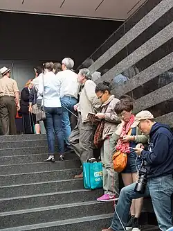The Clock premiered 15 October 2010 at White Cube's gallery in central London.[4] Since then, it has attracted hundreds of thousands of visitors and found crossover success beyond art patrons.[29][30] The Paula Cooper Gallery exhibited it in early 2011, where it attracted 11,500 visitors over the course of a month. In mid 2012, the Lincoln Center for the Performing Arts showed it to 18,000 people over six weeks.[31] MoMA heavily promoted its run with a silent disco, a New Year's celebration and a dedicated @TheClockatMoMA account on Twitter.[20] The month-long exhibition drew over 40,000 people.[31]