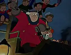 - The Coachman appears in the 1940 film adaptation by Walt Disney Productions, in which he is voiced by Charles Judels with a Cockney accent. He is an evil man or humanoid creature who first appears in the Red Lobster Inn with Honest John and Gideon, to whom he proposes, by offering them a large salary, to bring him some listless children to take to Pleasure Island, a place that arouses fear in the two scoundrels. The Coachman is also served by silhouetted minions with ape-like arms. In the film the Coachman's fate is unknown, but in a deleted scene, the Coachman notices Pinocchio's escape and hires Honest John and Gideon to apprehend him dead or alive, but the two are stopped and arrested by the carabinieri.[1] In the video game adaptation, he hinders Pinocchio's escape as a boss and is kicked off a cliff.