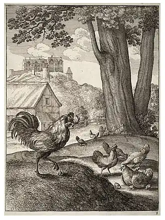 Samuel Croxall's prose retelling, originally published in 1722 and many times reprinted, also approaches this conclusion. Noting the fable's ambiguity, he comments that "the most probable intention of the author was to hold forth an example of industry and good sense. The lesson inculcated is the wisdom of estimating things by their intrinsic worth, and of refusing to be led away by doubtful fascinations from the known path of duty."[10] But the Cock's abstention from the trappings of the governing class is also capable of the political reading given it by John Ogilby in his Fables of Aesop paraphras'd in verse (1665).[11] The lesson there of maintaining the balance of social relations is emphasised further by Wenceslaus Hollar's accompanying print in which the cock astride its dunghill is wittily contrasted with the Germanic castle on the neighbouring hilltop.