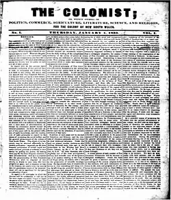 The Colonist was founded by John Dunmore Lang with a religious and political agenda.[1] First published on 1 January 1835 by Henry Bull and J. Spilsbury, The Colonist was published from 1835 until 1840,[2] after which it was absorbed by the Sydney Herald.[3]