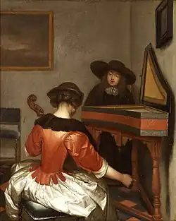 The Concert depicts two young women playing musical instruments in a domestic environment. The woman in the foreground plays the cello, while the young lady in the background plays the harpsichord. The mutual relationship between the two figures remains uncertain. The cellist, promintely depicted, is seated with her back to the viewer. She also attracts most of attention with her clothing in contrasting bright white and red tones. The carefully rendered textures and the metallic reflection of her white dress and red jacket are characteristic of Ter Borch's method. However, several other stylistic aspects in this work are not, such as the remarkably brightly lit room, the figure placed in the background, depicted in a loose brush, and the use of broad brushstrokes elsewhere. This apparent break in the artist style is largely due to two radical changes that the painting suffered since its creation.[3][4]