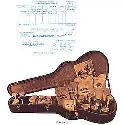 The booklet's back-cover picture showed an open guitar case filled with food and medical supplies, below a copy of the cheque for the Madison Square Garden box-office takings.[93] Wilkes intended this image to convey a sense of hope, signifying the completion of the task that the participants had set out to achieve for the refugees from East Pakistan.[98] The record's liner note essay accused the West Pakistanis of undertaking "a deliberate reign of terror" that represented "undoubtedly the greatest atrocity since Hitler's extermination of the Jews".[99]