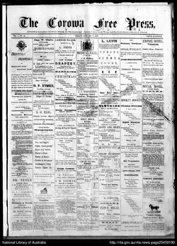 The Corowa Free Press was first launched by James Crauford Leslie and John William Hutchinson Wyse on 8 October 1875.[1][2] James Crauford Leslie (1848-1907) was born in Scotland and emigrated to Melbourne, Australia with his family in 1854.[1] In 1874 after being decorated for his involvement in the Maori Wars, he moved to Wahgunyah, Victoria to manage The Chronicle which served the cross-border towns of Wahgunyah and Corowa in New South Wales.[1] After The Chronicle folded in September 1875, Leslie crossed the border to set up The Corowa Free Press.[1] Wyse left the paper in 1880 and Leslie was the sole proprietor until his death on 20 February 1907.[1]