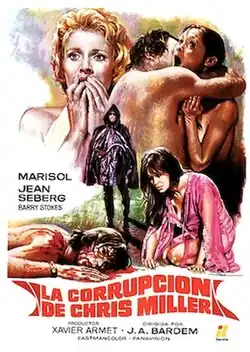 The Corruption of Chris Miller (Spanish: La corrupción de Chris Miller) is a 1973 Spanish psychological horror[3] film directed by Juan Antonio Bardem and starring Jean Seberg, Marisol, and Barry Stokes.[4] The film follows a woman and her stepdaughter who come to suspect a handyman they have recently hired is responsible for a rash of violent murders in their small mountain community. Marisol's first film in which she does not perform musical numbers. The only brief exception is a moment in which the three protagonists perform a verse of the song Au clair de la lune on guitar, in which Marisol sings a single verse. The film was Marisol's first film apart from Manuel Goyanes. Anabel Films founder and producer, actor Javier Armet, developed an original idea from Santiago Montcada to produce this high-budget, international film (number 7 in the USA). It was filmed outdoors in Comillas (Cantabria) and Las Fraguas (Cantabria) and indoors at Isasi Isasmendi's Esplugas Films Studios in Esplugas de Llobregat (Barcelona).