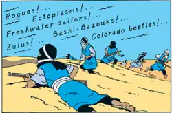 Whereas Hergé's use of Chinese in The Blue Lotus had been correct, the Arabic script employed in The Crab with the Golden Claws was intentionally fictitious.[29] Many of the place names featured in the series are puns: the town of Kefheir alludes to the French Que faire? ("what to do?") while the port of Bagghar derives from the French bagarre (scrape, or fight).[29] The name of Omar ben Salaad is a pun on salade de homard, the French for "lobster salad".[30]