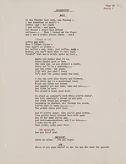 "I wrote both the words and the music of The Cradle Will Rock at white heat during five weeks in 1936," Blitzstein said,[6] "as a kind of rebound from my wife's death in May." The drafted short score was completed September 2, 1936.[4]: 157 Blitzstein signed with the William Morris Agency and began auditioning The Cradle Will Rock in one-man shows in the homes of New York producers including Herman Shumlin,[4]: 175 Harold Clurman for the Group Theatre, Charles Friedman for the Theatre Union, and Martin Gabel.[7]: 246