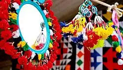 Sindhi Sagi/Choti: Sagi/Choti is a hair accessory used by Sindhi women and Punjabi women as well to tie their hairs into braids, it is made of many colors, beads, pompons, shells, mirrors etc, traditionally some Sindhi women also used a silver or gold jewelry on braids as well.[45]