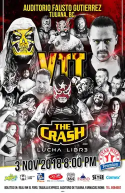 The Crash Lucha Libre began operating on 2011, focusing mainly on promotion professional wrestling event in Tijuana, Baja California, Mexico. Their first show was held on November 4, 2011 with a main event of El Hijo del Santo and Latin Lover defeating El Hijo del Solitario and Marco Corleone.[2] The Crash held shows on a limited schedule over the next couple of years; 4 in 2012,[3] 4 in 2013,[4] 2 in 2014,[5] and 5 in 2015.[6]