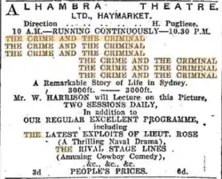 The Crime and the Criminal is a 1912 Australian silent film directed by Alfred Rolfe. It features the same railway collision as the climax in Do Men Love Women? (1912) which had come out only a few weeks prior. However the plots of the movies are different.[4][5]