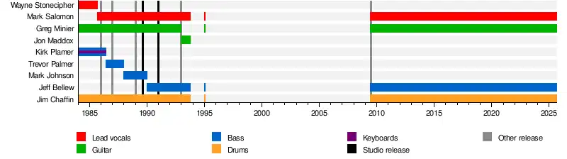 In late 1984, drummer Jim Chaffin, guitarist Greg Minier, bassist Kirk Palmer, and vocalist Wayne Stonecipher started a band named K.G.B. in Fresno, California[4][5] The four teens knew each other as high school classmates. The name K.G.B. had no meaning to it, the members just thought initials "sounded cool".[6] In early 1985, K.G.B. was looking for a new vocalist due to the departure of Stonecipher. Minier asked his friend Mark Salomon to try out as vocalist.