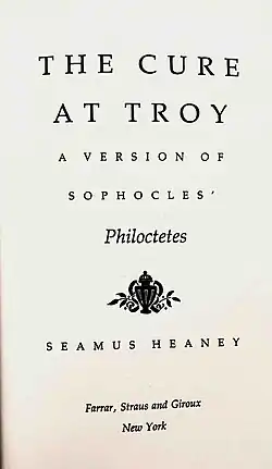 The Cure at Troy: A Version of Sophocles' Philoctetes is a verse adaptation by Seamus Heaney of Sophocles' play Philoctetes. It was first published in 1991.[1] The story comes from one of the myths relating to the Trojan War. It is dedicated in memory of poet and translator Robert Fitzgerald.[2]