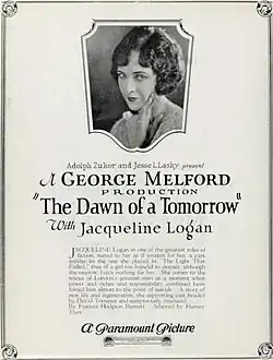 The Dawn of a Tomorrow is a 1924 American silent drama film directed by George Melford, produced by Famous Players–Lasky and distributed through Paramount Pictures, and starring Jacqueline Logan. It is based on the 1906 novel of the same name by Frances Hodgson Burnett which had been filmed before in 1915 also titled as The Dawn of a Tomorrow with Mary Pickford.[1][2] A play version had been produced on Broadway in 1909 which served as the final starring stage role for Eleanor Robson Belmont.