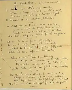 In writing the poem, Owen received help from Sassoon, who he elsewhere called one of his dearest friends. Sassoon's influence is apparent particularly in the poem's anger over injustice.[3] Owen described the experience in a letter in which he suggested that the middle sections needed work.[1] The night he met Sassoon, he began writing "The Dead-Beat", as described in the letter: "After leaving him, I wrote something in Sassoon's style... The last thing he said was 'Sweat your guts out writing poetry!' 'Eh?' says I. 'Sweat your guts out, I say!'"[4] Pat Barker, in her novel Regeneration, describes a fictitious workshop between the poets based on this letter.[1]