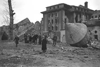 A report by Klimenko records that on 13 May, Mengershausen stated that he watched Hitler and Braun's bodies burn for half an hour as well as their burial in the crater Hitler's dog Blondi was buried in, reportedly from a distance of 600 m (2,000 ft), ten times the actual distance (and contrary to his later account of helping bury the remains).[177] Mengershausen specified the crater, which Klimenko says was where Churakov found the remains of the couple and two dogs on an unspecified date in May.[178]