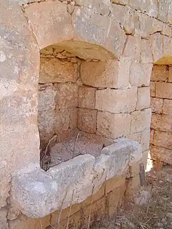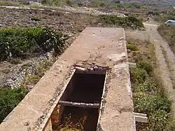 The building has a simple and modest vernacular architecture,[11] with slit windows, that function as ventilators, and waterspouts. It has no inscriptions or symbols to shed further information about its use apart from Roman numerals that were inscribed when it was converted to a farmhouse. These are found on the walls and woods, and record the sale of different types of vegetables by farmers.[5] The features of the building are examples of Maltese traditional architecture that include roofs built with limestone slabs and animal feeding mangers. Despite the conversion to a farmhouse, the building clearly does not look like it was originally meant to be one, as it is not a traditional Maltese farmhouse.[5] This and the position of the mangers prove that the building was built for horses. These characteristics may suggest that the building may have been a cow farm. The high roof of one of the buildings still prove that it is unlikely it was originally a cow farm, but it may be speculative to say that at one point it had been so.[5][6][8]