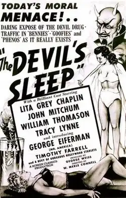 The Devil's Sleep is a 1949 exploitation film directed by W. Merle Connell and produced by George Weiss. Connell had previously directed a number of American burlesque films.[1] The film looks at juvenile delinquency, phony women's health gyms, and the pushing of narcotics to teenagers. Using many of the same cast and crew as Test Tube Babies, the film is the first of Timothy Farrell's "Umberto Scalli" trilogy.