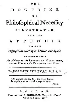 - ^ Priestley, Joseph. The Doctrine of Philosophical Necessity Illustrated; being an appendix to the Disquisitions relating to matter and spirit. To which is added an answer to the Letters on materialism, and on Hartley’s Theory of the mind. London: Printed for J. Johnson, 1777.