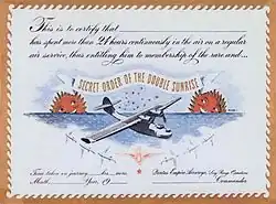 The Secret Order of the Double Sunrise was an illustrated certificate given to passengers aboard the flying boats of the Australia–England air link, to attest they had been airborne for more than 24 hours.[15][21]