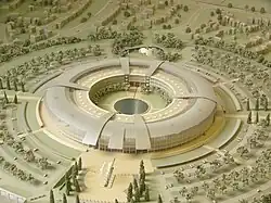 The Doughnut is the nickname given (due to its resemblance to a doughnut) to the headquarters of the Government Communications Headquarters (GCHQ),[1][3] a British cryptography and intelligence agency. It is located on a 71 hectares (176 acres) site in Benhall, in the suburbs of Cheltenham, Gloucestershire, in South West England.[5][6] The Doughnut accommodates 5,500 employees; GCHQ is the largest single employer in Gloucestershire.[5][6][7] Built to modernise and consolidate GCHQ's multiple buildings in Cheltenham, the Doughnut was completed in 2003, with GCHQ staff moving in the same year,[1] and fully moved into the building in 2004.[8] The Doughnut was too small for the number of staff at its completion, and a second building in a secret and undisclosed location in the 'Gloucestershire area' now also accommodates staff from GCHQ. The Doughnut is surrounded by car and bicycle parking in concentric rings,[3] and is well protected by security fencing, guards, and CCTV systems.