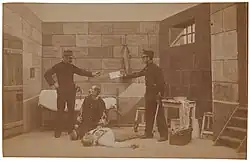 An ironworker with a strong resemblance to Dreyfus was hired for the role in order to increase the series's realism.[14] Méliès himself appears in the series as Dreyfus's attorney Fernand Labori and makes a brief reappearance as a journalist after Labori's attempted assassination.[15] At least one scene, Dreyfus's exit from the courthouse, appears to have been modelled on a news photograph printed in the journal L'Illustration.[16] Méliès drew on both cinematic and theatrical special effects for the series: the lightning in Landing of Dreyfus at Quiberon was added to the scene using multiple exposure, while the rain and rocking motion of the boat were created with stage machinery.[17] The gun smoke in The Attempt Against the Life of Maitre Labori is a puff of poudre de riz, a cosmetic powder.[18]