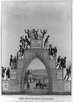 The Drunkard's Progress: From the First Glass to the Grave is an 1846 lithograph by Nathaniel Currier. It is a nine-step lebenstreppe on a stone arch depicting a man's journey through alcoholism. Through a series of vignettes it shows how a single drink starts an arc that ends in suicide. Below the structure, the protagonist's wife and child stand in tears.