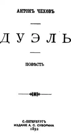 "The Duel" was first serialized in Aleksey Suvorin's newspaper Novoye Vremya from October–November 1891, after which Suvorin edited the novella and published it as a separate edition. The book enjoyed nine re-issues during the 1890s. Chekhov included "The Duel" in Volume 6 of his Collected Works, published by Adolf Marks in 1899–1901.[1][2]