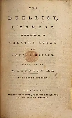 The Duellist is a 1773 comedy play by the British writer William Kenrick.[2] It premiered at the Theatre Royal, Covent Garden on 20 November 1773. The original Covent Garden cast included Henry Woodward as General Gantlet, William 'Gentleman' Smith as Captain Boothby, Edward Shuter as Sir Solomon Bauble, John Quick as Serjant Nonplus, William Thomas Lewis as Counsellor Witmore, Richard Wroughton as Lord Lovemore, John Cushing as Mactotum and Jane Green as Lady Bauble.[3]