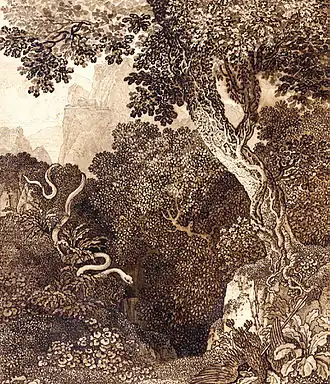 A contemporary French emblem book took a different view of how the bird had contributed to its own hurt. Daniel de la Feuille's Devises et emblêmes (1691) starts from the perception that the bird in the poem was on the look-out for a hare. If another hunter brings it down while so engaged, then it is a case of poetic justice, of having inflicted on itself the harm it was purposing to inflict on others. Illustrated under the Latin title Capiens capior (the preyer become prey), it shows a sparrow hawk perched on a hare with an arrow through its own neck.[8] There is also a coded reference to the fable in a mountain landscape by Anne-Louis Girodet dating from 1793/5. There an eagle pierced by an arrow lies at the foot of the picture, while towards it a huge snake is crawling across the rocks. Its writhing is echoed by the strangling ivy that climbs the tree beneath which the bird has fallen. Violence and cruelty is not limited to the human sphere; in the artist's eyes they are characteristic of nature as a whole.[9]