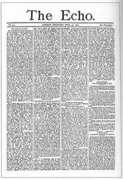 The Echo, founded in 1868 in London by Cassell, Petter, Galpin & Co., was London's first halfpenny evening newspaper (earlier provincial titles included Liverpool's Events[1] and the South Shields Gazette, both launched in 1855). It was published daily except on Sunday. Sometimes its Saturday edition appeared under the name The Cricket Echo or The Football Echo. Issue Number 1 appeared on 8 December 1868. The Echo ceased publication with Issue Number 11,391 on 31 July 1905.[2]