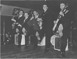 Chris Wayne had another tour planned, this time with Gene Vincent, so he decided to reform The Echoes. Wayne had a drummer, Laurie Jay, but needed guitar, piano and bass. The Dynamos agreed to do this tour as The Echoes, as they had recently parted from Sonny Stewart. They became The Echoes to accompany Gene Vincent when he visited Britain at the beginning of 1961.[6] The line up of this group was Laurie Jay (drums), Tony Collins (guitar), Les Smith (piano) and Douggie Reece (bass). During this tour Tony Collins had a car accident and was unable to continue. For the remainder of the tour he was replaced by Big Jim Sullivan. After the tour, it was decided to continue the Echoes, as with their ability to stand alone as a band and to also play for other artists, meant that work, including touring, was assured. Les Smith (piano) left the group after the tour to continue his career as an architect. His replacement was Ian Hines (piano), brother of Frazer Hines who played Jamie in the Doctor Who television series. Collins was unable to continue after his accident, so Billy Kuy became the new guitarist. Another national tour ensued with Frankie Howerd, The Mudlarks and Matt Monro. In late August, Kuy left to join The Outlaws and was briefly replaced by the 16 years old Vic Briggs, who was on his school holidays and could only participate for three weeks. His first gig with The Echoes was a variety show at the Royalty Theatre in Chester. The Echoes need to find a more permanent replacement, and the returning Dave Burns took the role.[7] Hines also left to work in Hamburg, and was replaced by Perry Ford. On New Year's Eve in 1961, The Echoes accompanied Bert Weedon on the television show Sunday Night at the London Palladium. The others on that show were Eve Boswell, Alma Cogan, Lonnie Donegan, Vera Lynn, Garry Miller, Cliff Richard, Roy Castle, Ronnie Carroll, Cleo Laine, Bert Weedon and The Echoes, Bruce Forsyth (compere), and Jack Parnell and his Orchestra. After this appearance The Echoes were approached by Vox, who eventually sponsored them from 1962 until 1971 with all the group's equipment. Perry left in early 1962 to pursue his own career and Hines, back from Hamburg, rejoined the group for a short while.