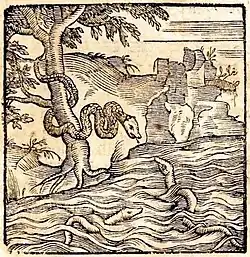 The fable of the Eel and the Snake was originated by Laurentius Abstemius in his Hecatomythium (1490).[1] Versions of it appeared in several European languages afterwards and in collections associated with Aesop's Fables.