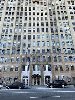 Most of the ground floor contains windows and doors that lead to professional apartments there.[35] The doors have Art Deco-style curved railings.[5][36] The main entrance on Central Park West contains three angled bronze arches at ground level, each of which corresponds to two bays. The spandrels above the arches, between the ground and second stories, are decorated with geometric patterns and motifs of birds.[5][37] On the second story, there are two windows above each arch, or six in total, separated vertically by a stepped bronze pier with an incised geometric pattern. On the third story, there are three cast-stone piers at the center of the facade, which correspond directly to the bronze piers below them.[5] Additionally, service entrances with Art Deco designs are placed on the westernmost end of the 90th and 91st Street frontages.[28]