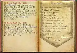 Tribunal features several minor quality of life gameplay additions, including the modification of the game's quest journal system. In the original game, the journal records entries in linear chronological order, which can become lengthy and cumbersome as the game progresses. Tribunal introduces changes to the journal interface allowing a player to sort their journal by quest name and distinguish between active and completed quests. Other interface additions include the ability to annotate the game's map.[3] The expansion introduces hireable followers who can travel with the player. This includes a mercenary who can use weapons and armor provided by the player, so long as they are paid a regular fee. The player can hire a pack rat who can carry items from the player's inventory.[3] In addition, the Museum of Artifacts provides the player with an avenue to sell high-value items obtained in the original game.[4]