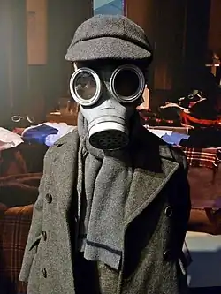 The filming took place during the fourth production block.[3] Special effects shots were completed at Unit Q2 in Newport on 17 and 18 December 2004.[3] From 4 to 8 January and from 11 to 14 January scenes at Cardiff Royal Infirmary were filmed.[3] On 9 and 10 January scenes shot in alleyways were filmed in Womanby Street, Cardiff. The bar scenes were also shot on 10 January at Headlands School in Penarth.[3] The scene in which Rose hangs from the barrage balloon was filmed in a hangar at RAF St Athan and then in the Vale of Glamorgan, on 17 January.[3] From 18 to 20 January filming involving Jack's ship and the TARDIS took place at the studio at Unit Q2. Extra TARDIS scenes were shot on 7 February.[3] Scenes in the Lloyd's house were filmed on 28 January.[3] Glamorgan House in Cardiff was used for the officers' club scene on 8 February.[3] Location filming also took place at the Barry Tourist Railway.[4] Barry Island and its now-demolished Butlins holiday camp had previously been the filming location of the Seventh Doctor serial, Delta and the Bannermen.[5]