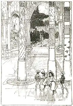 The enchanted castle of the title is a country estate in the West Country seen through the eyes of three children, Jerry, Jimmy, and Kathy, who discover it while exploring during the school holidays. The lake, groves and marble statues, with white towers and turrets in the distance, make a fairy-tale setting, and then in the middle of the maze in the rose garden, they find a sleeping fairy-tale princess.