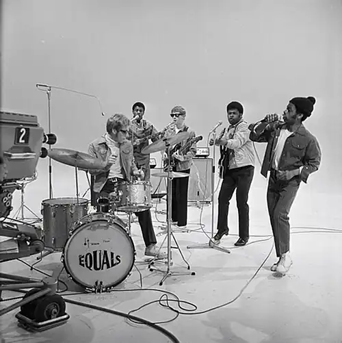 The group's members met on a Hornsey Rise council estate,[5] where Grant, Lloyd and Hall were school friends at Acland Burghley. In late 1964, Hall suggested that they form a band. John Hall (drums), Eddy Grant (lead guitar), Pat Lloyd (rhythm guitar), Derv Gordon (vocals) and Lincoln Gordon (rhythm guitar) became the Equals. The three-guitar lineup continued until 1969, when Lincoln Gordon switched from rhythm guitar to bass.