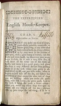 - ^ The book's full title is The Experienced English Housekeeper, For the Use and Ease of Ladies, Housekeepers, Cooks, &c. Wrote purely from Practice, and dedicated to the Hon. Lady Elizabeth Warburton, Whom the Author lately served as Housekeeper: Consisting of near Nine Hundred Original Receipts, most of which never appeared in Print.