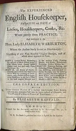 The Experienced English Housekeeper[a] is a cookery book by the English businesswoman Elizabeth Raffald (1733–1781). It was first published in 1769, and went through 13 authorised editions and at least 23 pirated ones.[1]