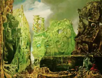 For The Eye of Silence Max Ernst employed a technique called decalcomania to create arbitrary textures on the canvas, which he then reworked to resemble rock formations and forms of animals, plants, and architecture.[4] The imagery on the surrealist canvas has been described as a primordial-like landscape, "in which rock-hard and gelatinous formations coexist under a forbidding sky."[1] The Eye of Silence has also been described as, "part vegetation, part rock and part bejewelled baroque palace. A fusion of animal, mineral and vegetable, the painting's texture suggests bone, rag, feather and stone all at once, whilst the lake or chasm situated in its middle ground is carved out of a rock placed illogically against the sky…"[3]