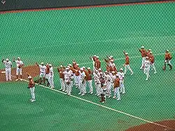 The song is sung at momentous occasions such as graduation and even solemn occasions such as funerals. Led by the Longhorn Marching Band, it was sung at the July 14, 2007, funeral of First Lady Lady Bird Johnson, an alumna of the University of Texas.[4][5] When singing the song, participants generally raise their right arm with their hand making the Hook 'em Horns symbol of The university.[5] A recording of "The Eyes of Texas" was played over the Rose Bowl public-address system when the Dallas Cowboys defeated the Buffalo Bills to win Super Bowl XXVII, while Madison Square Garden organist Ray Castoldi played it when the Houston Rockets defeated the New York Knicks in the seventh game of the 1994 NBA Finals to clinch Texas' first NBA championship.